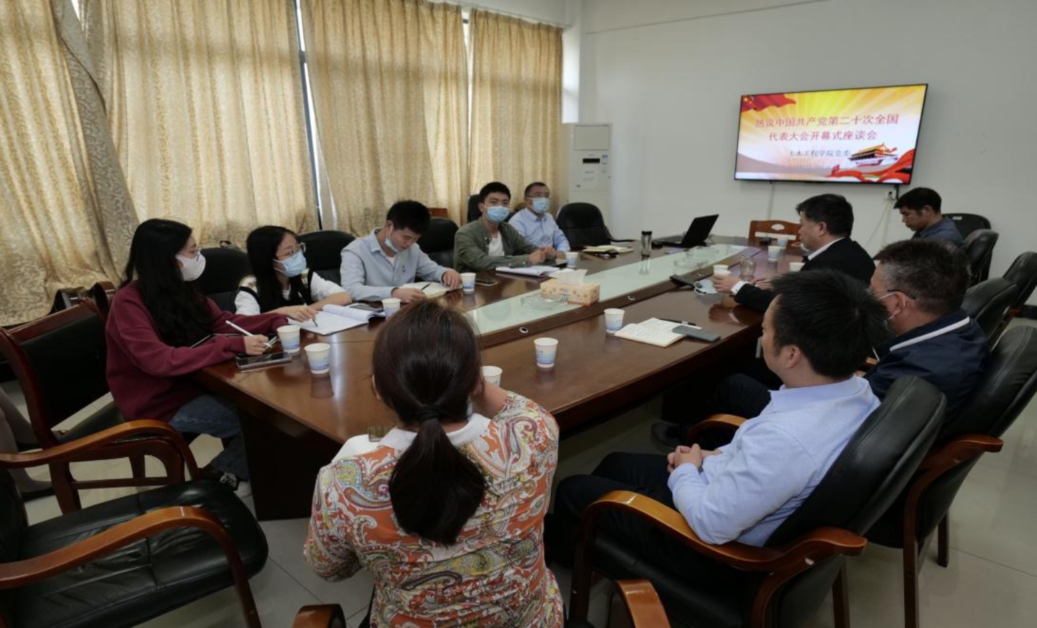 直播结束后,院党委及领导班子、科研代表、教师代表、辅导员代表以及学生代表在土木楼213A办公室和230办公室对“二十大”精神进行交流讨论。