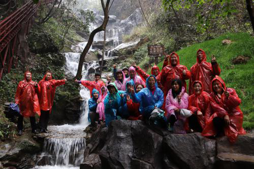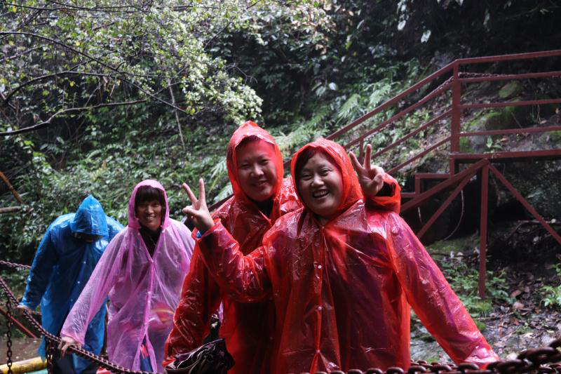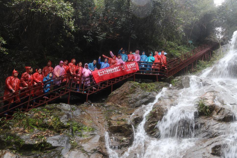 千姿百态小瀑布群,或像白带子悬挂山间,或像雨雾水帘,或似天女散花,拍打着石头,笛韵笙音,十分惬意!景区古藤老树,奇山怪石,鸟语花香,随处可见。潺潺溪水,清澈无污,喝一口,沁扉心田。瀑布飞溅和小雨融合在一起,让大家置身于绿色乐园森林大氧吧,感受“欢乐向前冲”的欢笑与刺激。20多个体验项目,大家互帮互助,全身心的参与,舒活筋骨。真正让女职工感受到学院的关爱,节日的祥和气氛。