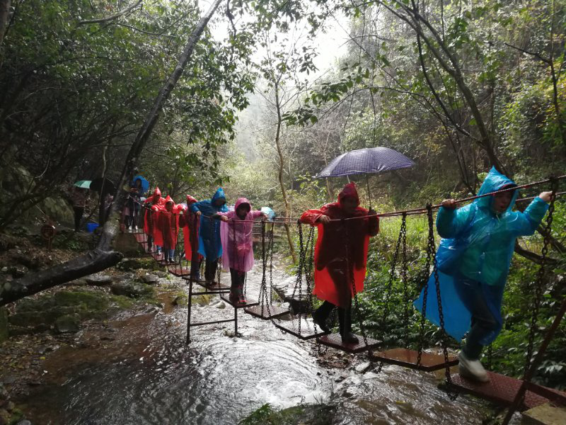 中餐后乘车赴【皇龙大峡谷景区】,天公不作美,下起小雨,但丝毫没有降低大家的热情,穿上雨衣,大家踩“浮动梅花桩”,过“双龙潭”,勇渡“铁索桥”、爬“壁虎网”、“滚木桥”、“云梯”等,完成近20个拓展项目。