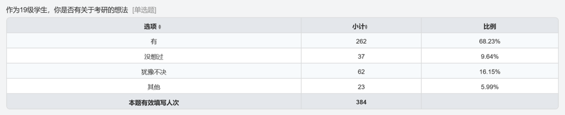 对于19级学生,有68.23%的同学有考研的想法,有9.64%的同学没有想过,有16.15%的同学还在犹豫不决,其他占5.99%,综上可见想继续考研的人占绝大多数,以后的考研大军可能继续扩大,考研压力也可能越来越大,同学对自己有了更高的要求。