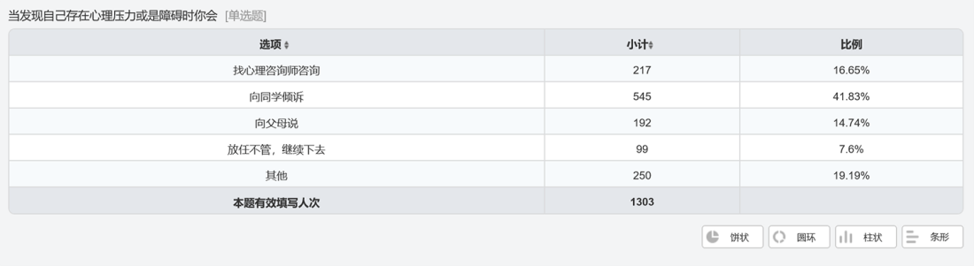 当发现自己存在心理压力时,16.65%的同学会找心理咨询师咨询,41.83%的同学会向同学倾诉,14.74%的同学会向父母诉说,7.6%的同学会放任不管,继续下去,还有19.19%的同学会选取其他方式,其中向同学诉说的人数居多,说明同学还是学生们的第一选择,但无论选择哪种方式,同学们都会去解决自己的心理问题,是个不错的趋势。